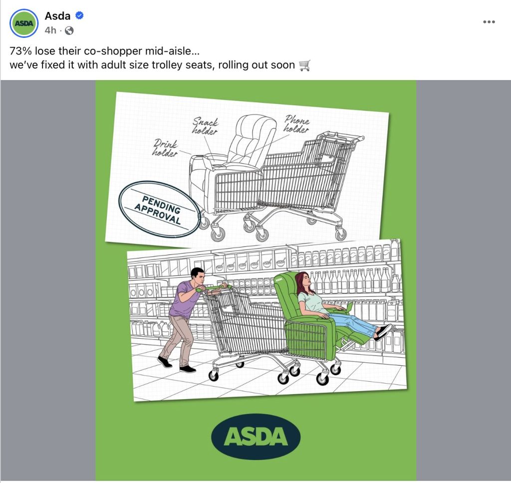 Asda has unveiled new adult-sized trolly seats in an effort to tackle ‘co-shopping’ chaos after research revealed that 73% of people confessed to losing their shopping partners in the aisles.