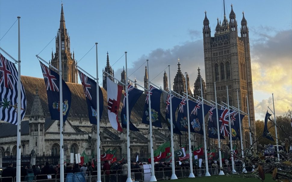 A crowd of more than a hundred people have gathered and formed a human chain in Westminster to call for the release of former Pakistani prime minister Imran Khan.