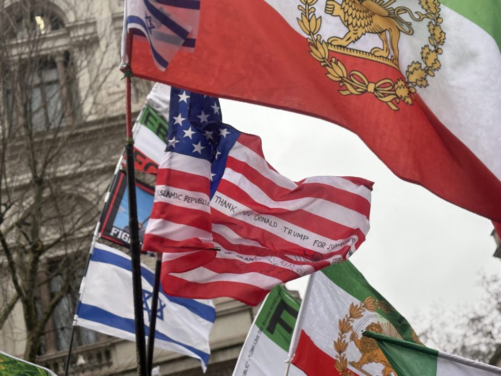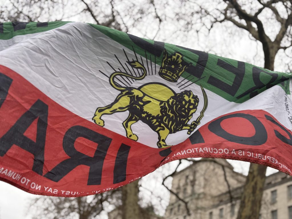 A new future? A sun and lion flag from pre-revolutionary Iran flies at Sunday’s protest with the words “Freedom for Iran” emblazoned on it. Image credit: Megan Norcott