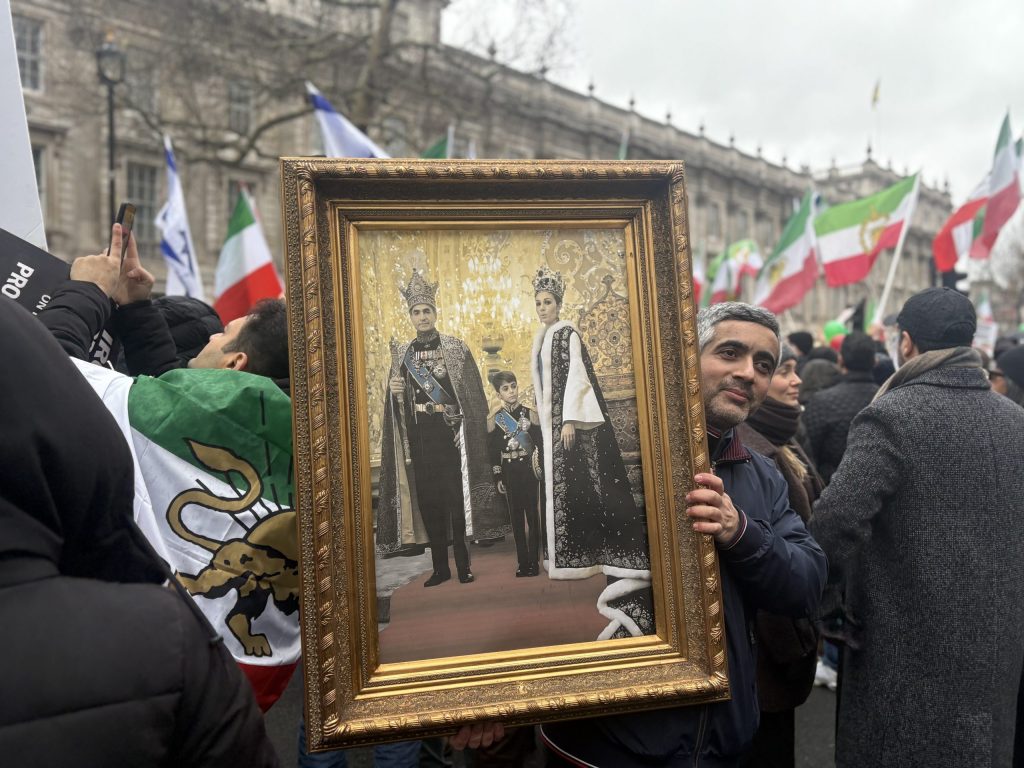The return of the monarchy? A man proudly holds a portrait of the last royal family of Iran, with Reza Pahvali at the centre. Image credit: Megan Norcott