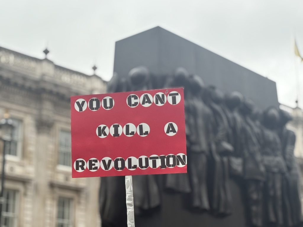 Defiant: Karimi’s sign in front of the Women of World War 2 monument in Whitehall provokes thought about the sacrifices women have made for freedom in their countries. Image credit: Megan Norcott