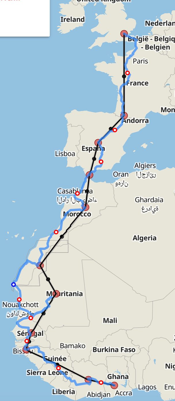 The scheduled route starts in Folkestone, where some of Sarpong’s ashes will be spread, before moving through France, specifically to Lourdes, then Spain, Gibraltar, Morocco, Western Sahara, Mauritania, Senegal, Guinea, Ivory Coast, and finally Ghana.